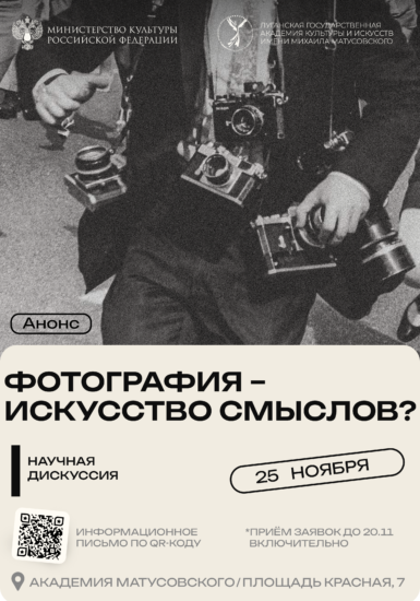 Уважаемые коллеги и студенты! ИНФОРМАЦИОННОЕ ПИСЬМО 25 ноября 2025 г. Уважаемые коллеги! Академия Матусовского приглашает вас принять участие в Научной дискуссии «ФОТОГРАФИЯ – ИСКУССТВО СМЫСЛОВ?»